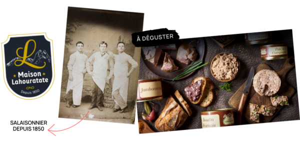 Pour la petite histoire, la maison Lahouratate existe depuis 1850 et, aujourd’hui, c’est la 6ème génération de « salaisonniers » qui a repris la vocation familiale. Les Lahouratate sont originaires de la Vallée d’Ossau et, depuis le XIXème siècle, les fils suivent la même voie que leur père et construisent de génération en génération, l’attachement aux saveurs et à l’authenticité, la réputation et le savoir-faire de la famille… « Chaque produit doit avoir le goût du partage et doit être une fête gustative ! ».