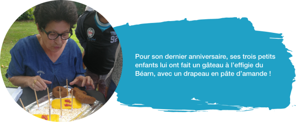 Le Béarn, c’est son ADN, Marie-Hélène se nourrit quotidiennement de cette culture : elle aime les canteras, s’associe à toutes les promotions du territoire, ne rate jamais une occasion de partager et de transmettre son amour pour ce terroir : « quand je me suis mariée, j’ai voulu qu’il y ait un chant béarnais à l’église et à ma mort, je souhaite également que l’on chante en béarnais ! ». Pour son dernier anniversaire, ses petits enfants lui ont fait un gâteau à l’effigie du Béarn, avec un drapeau en pâte d’amande, auquel elle tient tant !